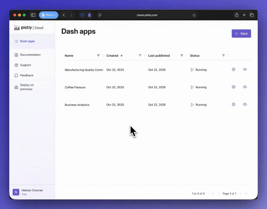 pip install "dash[cloud]"to add the Plotly Cloud extension. Once added, you can log in and manage your app deployments as you develop, keeping your live app in sync with your development flow. You can keep track of app status, quickly jump to app settings, and access the live app without leaving your development environment.